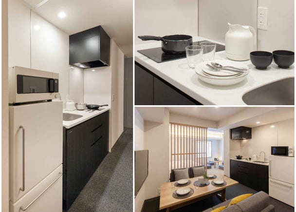 房內統一成「和風」感,設有完備的廚房和飯廳。另外也提供日本家電用品出租,在一樓的共用區裡則有洗衣機(須另外付費)。